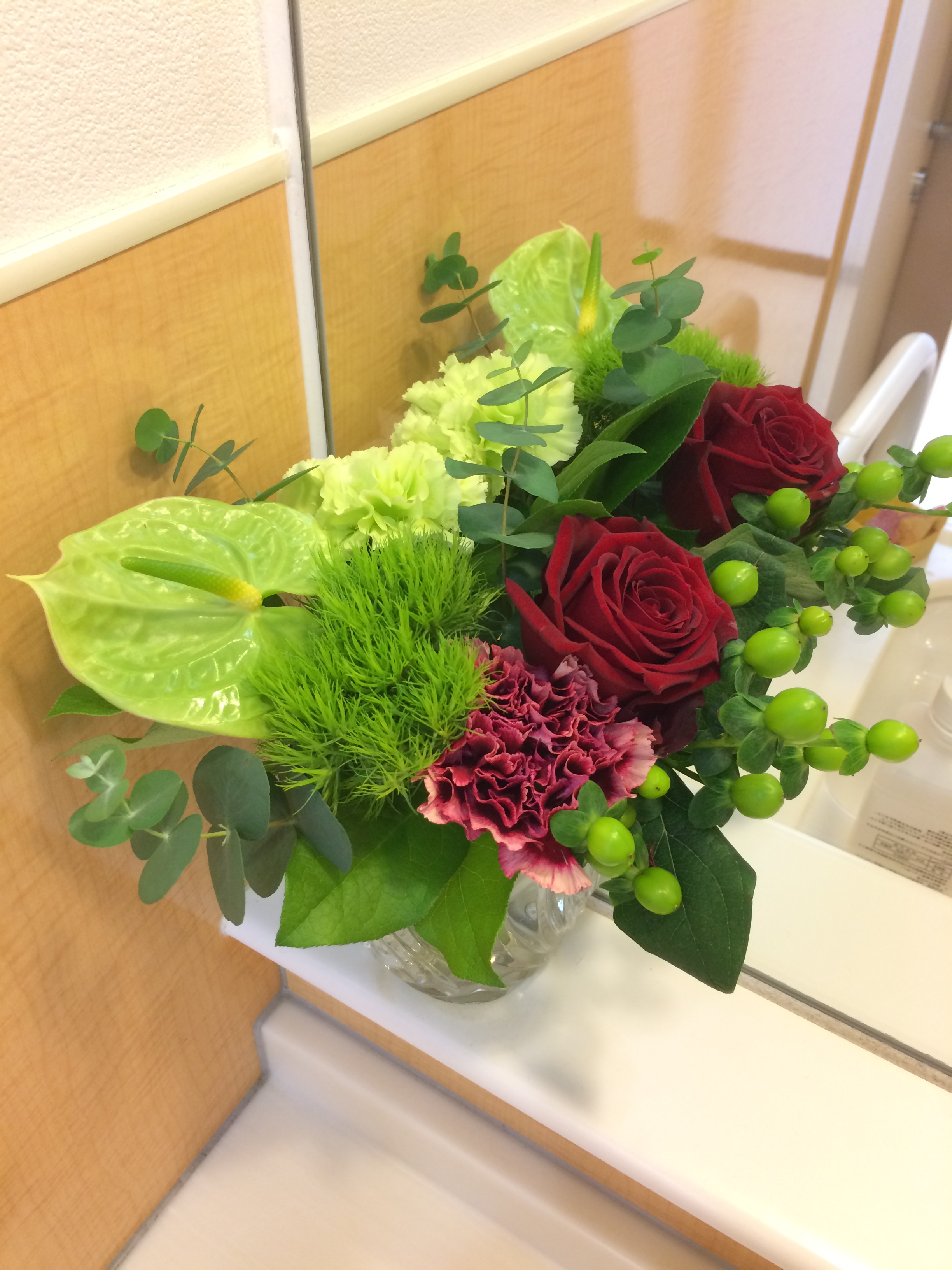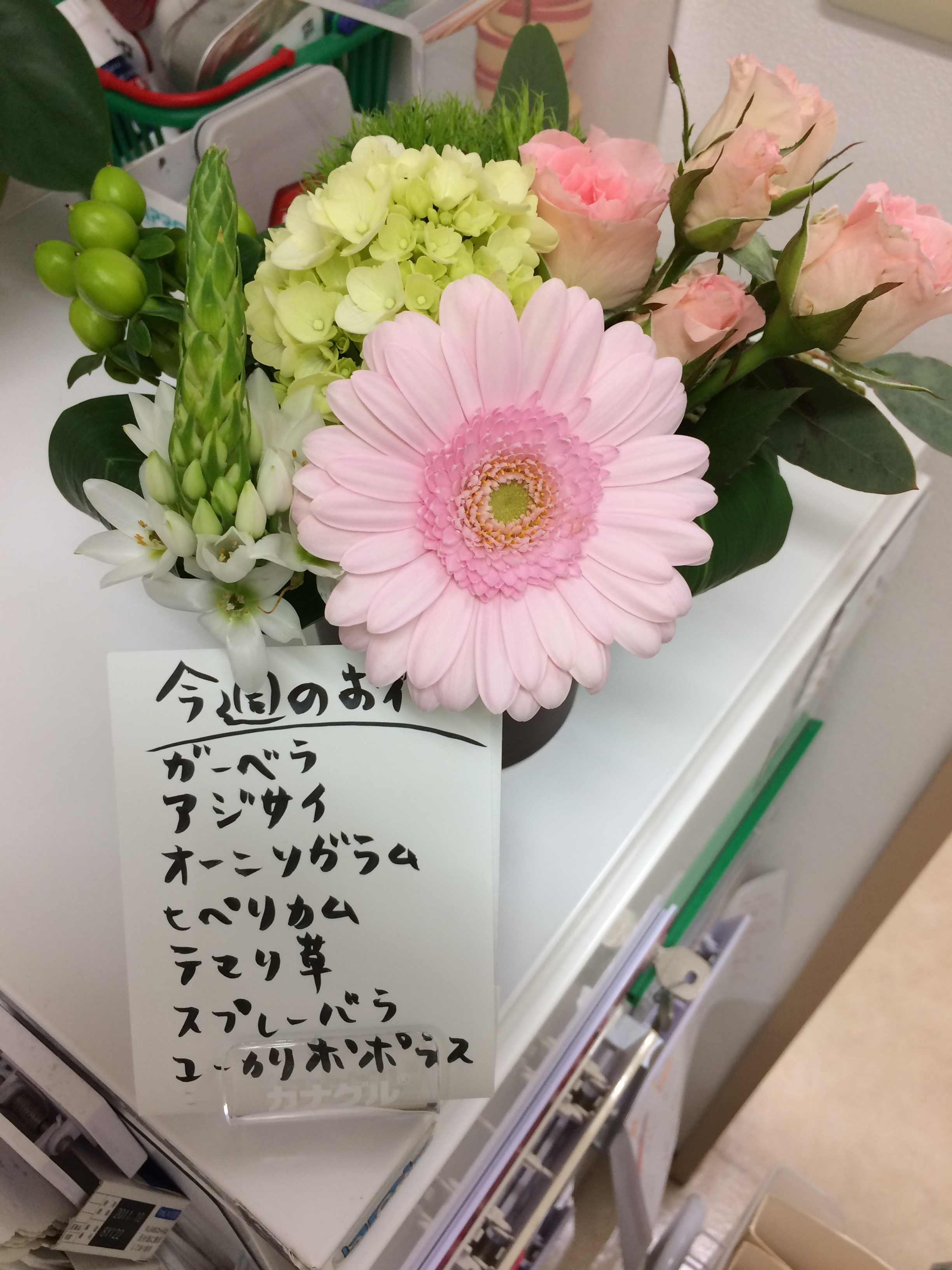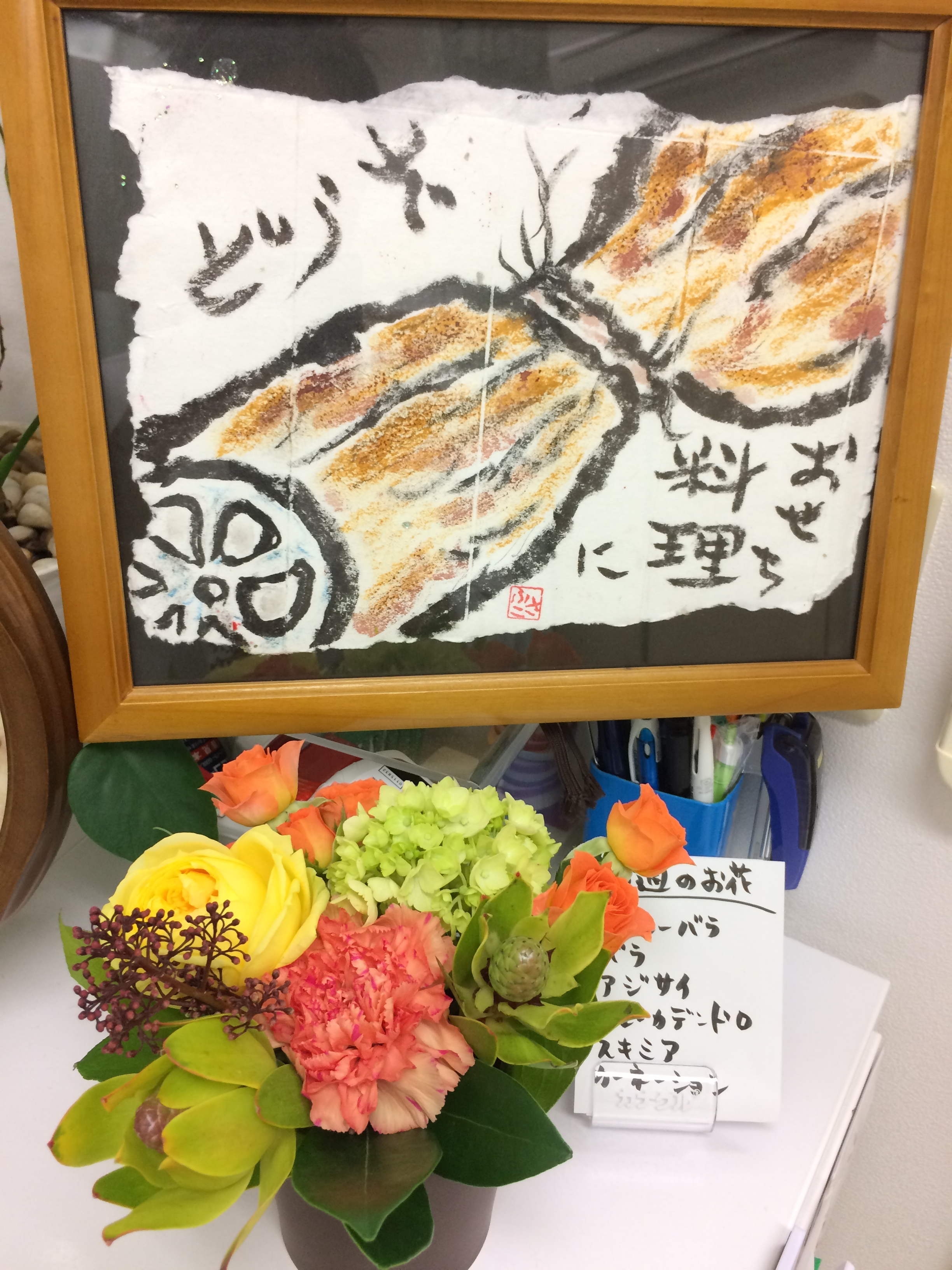 11月15日のミニアレンジ Leave a reply お花の後ろの絵手紙は、当院通院中の患者さんの作品です!おせち料理のれんこんって、穴がたくさんあり覗くと先が見えることから、将来の見通しが良くなりますようにとの願いが込められているとのことです^^感謝!