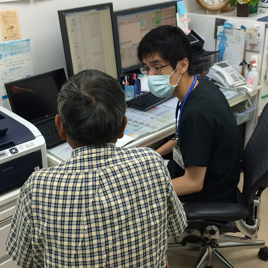当院は市立西脇病院の研修プログラムの一環として、1名につき2週間、研修医を受け入れています。外来業務や訪問診療はもちろんのこと、病院では経験することが少ない、学校健診、介護保険の審査、退院時拡大カンファレンスの出席等、われわれ開業医とともに2週間みっちり過ごしてもらいます。